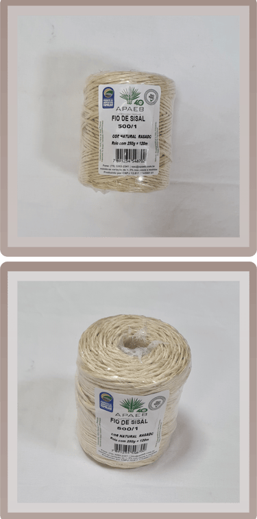 Pesos considerados para o rolo padrão de 220m ou 100m (a partir de 30mm) Cordas produzidas na cor natural Composição: 100% fibra de sisal Utilizados principalmente para Artesanatos, Decoração e Amarração em Geral Variação admitida nos pesos e medidas de até 5%